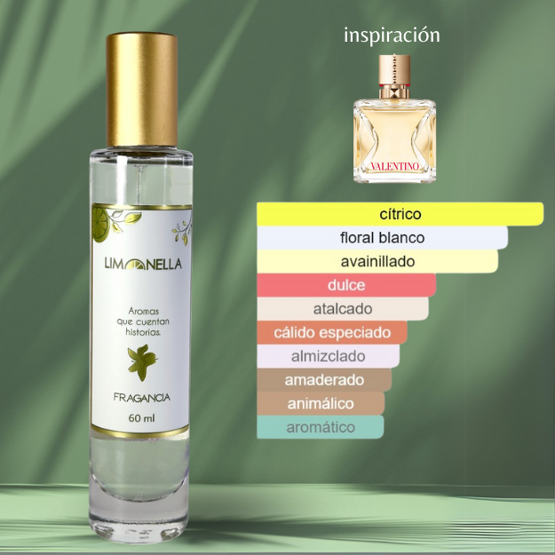 Las Notas de Salida son mandarina, bergamota y jengibre; las Notas de Corazón son flor de azahar del naranjo y gardenia; las Notas de Fondo son vainilla, haba tonka, almizcle, sándalo y musgo de roble.