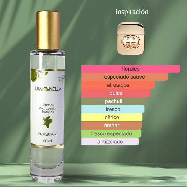 Las notas de salida son pimienta rosa, mandarina y bergamota; las notas de corazón son lila, durazno (melocotón), geranio, jazmín y grosellas negras; las notas de fondo son pachulí, ámbar, almizcle blanco y vainilla.