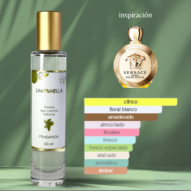 Eros Pour Femme de Versace es una fragancia femenina seductora, vibrante y luminosa que combina la frescura de frutas cítricas con la sensualidad de flores blancas y un fondo cálido y ambarado. Se abre con notas chispeantes de limón siciliano, bergamota y granada, da paso a un corazón floral de jazmín sambac, peonía y flor de azahar, y culmina en una base intensa de almizcle, ambroxan, sándalo y maderas suaves. Es perfecta para usar tanto de día como de noche, ideal para primavera, verano y otoño, especialmente en citas o eventos donde quieras dejar huella. Tiene un estilo entre elegante y atrevido, ideal para mujeres seguras de sí mismas que buscan un aroma femenino con carácter y mucha presencia.
